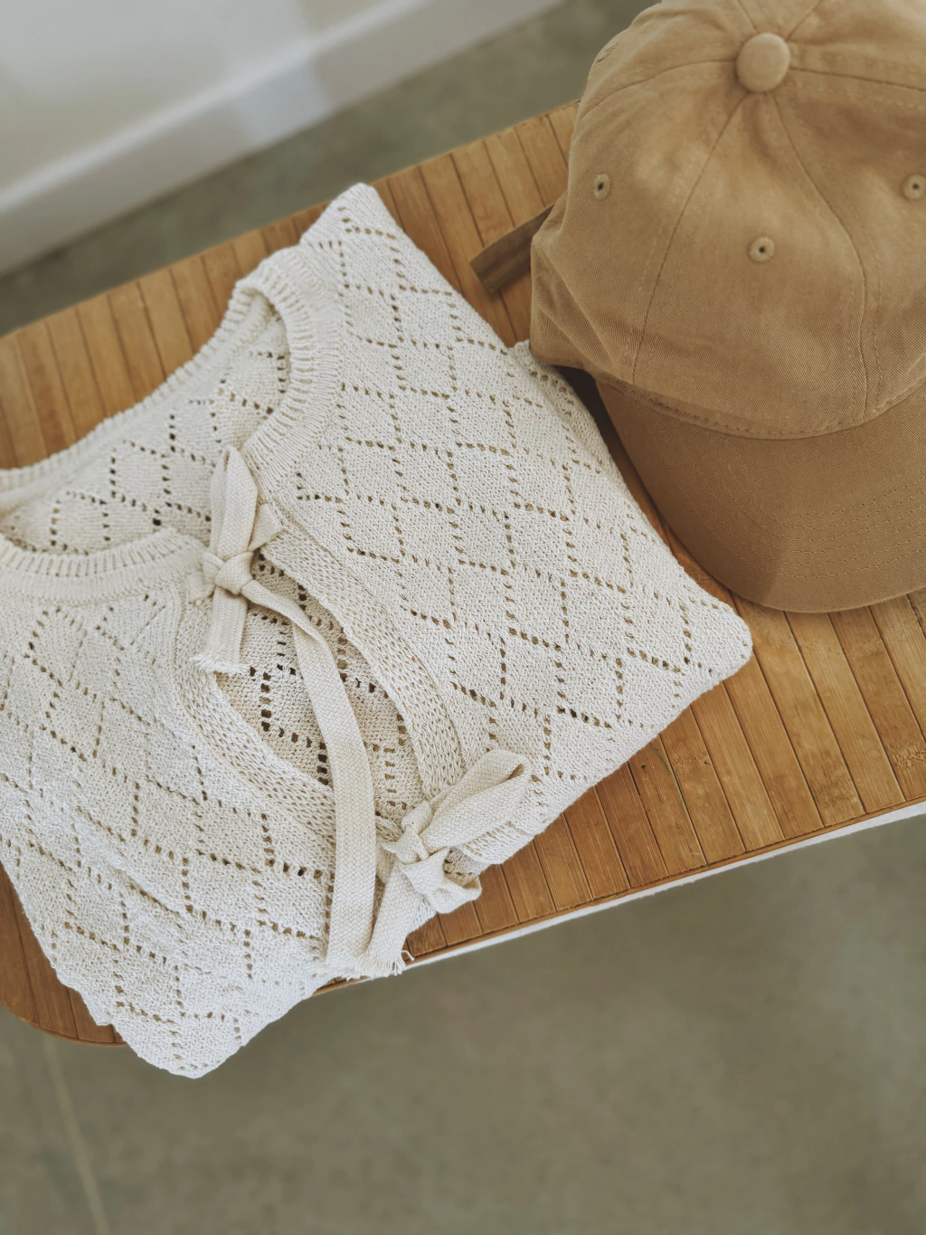 Descubre el Cárdigan calado de hilo de algodón que transformará tu guardarropa. Este diseño único, disponible en un elegante color crudo, combina confort y estilo a la perfección.